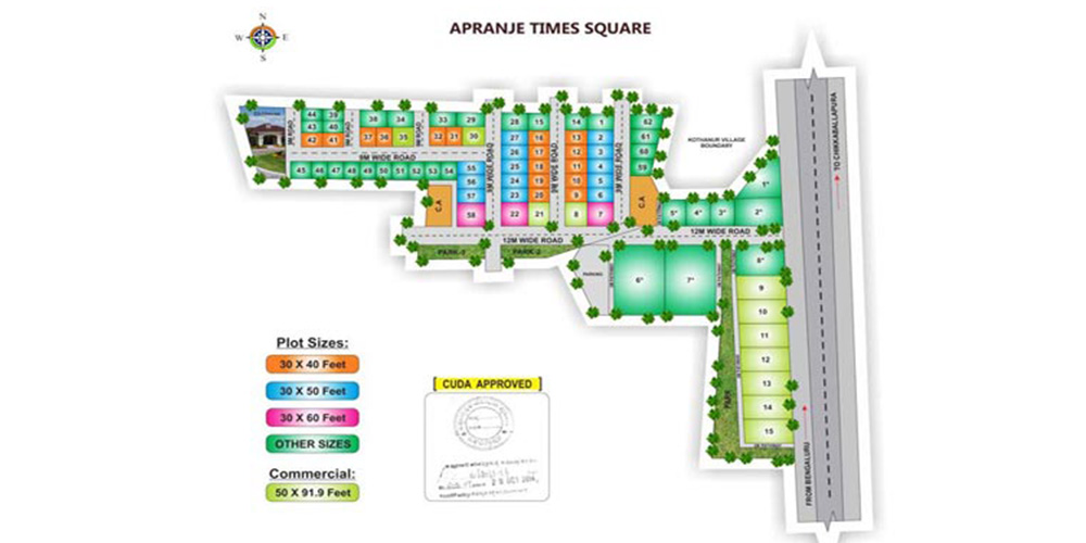 Apranje Elite Times Square is the latest residential project located in Chikkaballapur, North Bangalore. The project is the brainchild of Apranje Estates, and brings in plotted developments. These homes are well equipped with all the modern day specifications, and round the clock security services Apranje Elite Times Square has 77 units on sale. APPROVAL CUDA FEATURES Tar Roads Underground Electrification UNITS Commercial Plots: 7 Plots/ Proposed Villas: 70 Floor Plan at Apranje Elite Times Square Plots - 1200 sq. ft. Plots - 1500 sq. ft. PROJECT HIGHLIGHTS 4 Minute from Brigade Atmosphere Facilities offered at Apranje Elite Times Square Apranje Elite Times Square brings in some basic specifications required for a comfortable living, and that include round the clock power backup, firefighting systems, car parking, club house, children's play area, garbage disposal units, landscape garden, paved compound, rain water harvesting units, gated community, and property staff, among others. About Locality Chikkaballapur sits in the northern zone of Bangalore, and has come up as an established residential locality. The credit for such a development here goes to its proximity with the special economic zones, presence of companies operation across various verticals, ferrous infrastructure, intercity connectivity, modern day conveniences, and rapid urbanization. North-south 6-lane NH-7 and East-West NH 234 pass through this location, making it a transportation hub. Chikkaballapur also comprises of a new bus terminus and train station headquarters. Bengaluru International Airport is located just of 20 kilometers from Chikkaballapur. About City Suburbs of Bangalore are doing really well when we talk about real estate. Launch of new homes is pretty evident, and they have attracted a lot of buyers and investors to put in their money. Offering great infrastructure, homes building on walk to work concept, and great connectivity to the rest of the city makes these suburbs the new favorite of IT professionals here. These localities can be regarded as the latest hubs for realty boom in IT capital of India. Total Project Area: 7.50 Acres Project Details: 77 Units Configurations: Land