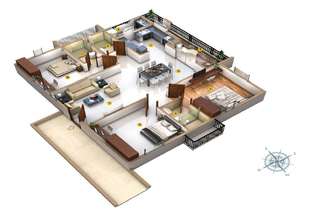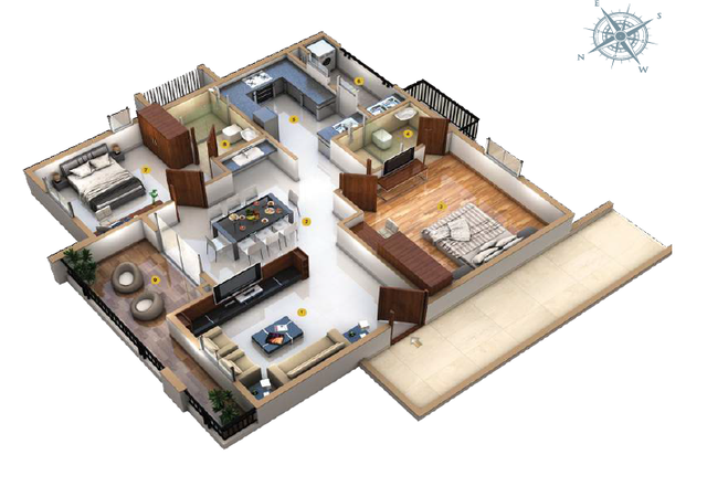 MASTER BED ROOM: LAMINATED WOODEN FLOORING OTHER BEDROOMS, LIVING, DINING & KITCHEN: VITRIFIED TILES OF SIZE 80 CM X 80 CM. BATHROOMS: ACID RESISTANT, ANTI-SKID CERAMICS TILES 300X300 MM OF REPUTED BRAND. BALCONIES: ACID RESISTANT, ANTI-SK