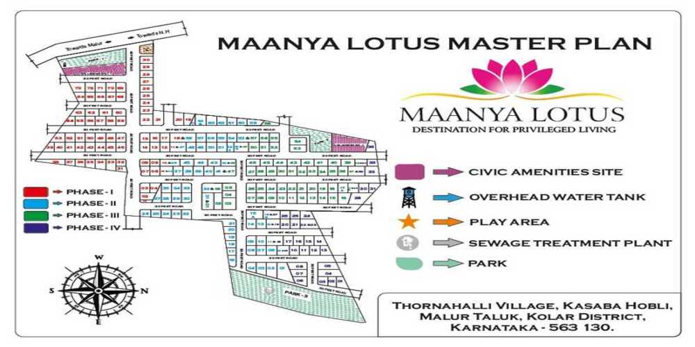 Maanya Lotus presents Plots designed to reflect contemporary lifestyle. Loaded with amenities and strategically located, Maanya Lotus is an address only for the privileged few. These Residential Plots in Bangalore relish a magnificent view and presents a perfect example of comfort and luxury. Maanya Lotus by a renowned builder Maanya Ventures in Narasapura Industrial Road guarantee a hassle free lifestyle to its inhabitants. The amenities in Maanya Lotus comprises of CCTV Cameras, Entrance Gate With Security Cabin, Gated Community, Landscaped Garden, Play Area, Rain Water Harvesting, Security Personnel, Street Light. Location of Maanya Lotus is perfect for the ones who desire to invest in property in Bangalore with many schools, colleges, hospitals, supermarkets, recreational areas, parks and many other facilities nearby Narasapura Industrial Road. Maanya Lotus Project Address :- Narasapura Industrial Road, Guguttahalli, Hoskote, Bangalore, Karnataka, INDIA.. Maanya Lotus Unit configuration from 1200 sqft.