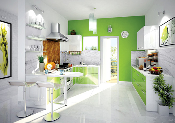 2' DADO WITH PREMIUM DESIGNER TILES ABOVE KITCHEN GRANITE COUNTER TOP WITH SINGLE BOWL STAINLESS STEEL SINK WITH DRAIN BOARD PROVISION FOR WASHING MACHINE AND IRON POINT IN UTILITY AREA