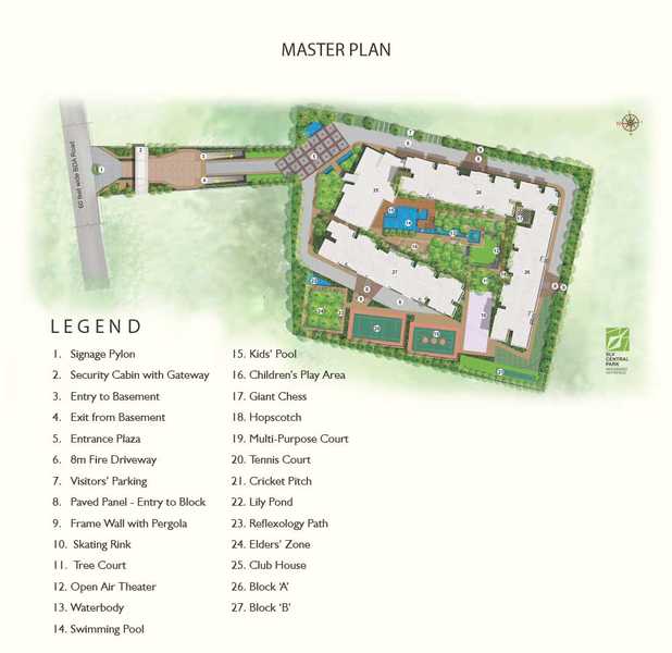 SLV Central Park has been designed to improve both life and lifestyle in Old Madras Road, Bangalore. With spectacular natural vegetation on all sides and a body of relaxing water that winds in the centre, you have a truly luxurious and peaceful atmosphere to return home. The epitome of luxury living in the midst of nature. With a vast open area for fruit orchards, lawns, water channel with pool and children's pool, pedestrian paths and pavilions, SLV Central Park brings nature to your home. Here, a first-class feature is the access ramp, which enters and leaves the complex, which goes directly to the basement parking lot, thus preventing any movement of vehicles at ground level. The ground area is a "NON-TRAFFIC AREA". An additional unique feature of the project is the way in which the entire open area is designed, with defined areas for the elderly, middle-aged people and children.