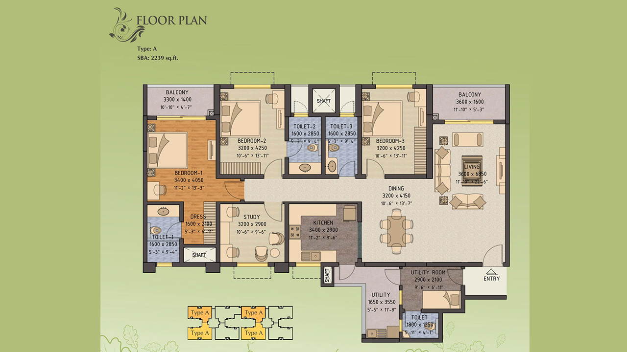 | S.No. | BHK | Area (SQ. FT.) | Price/Sq.Ft | Base Cost |