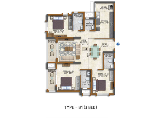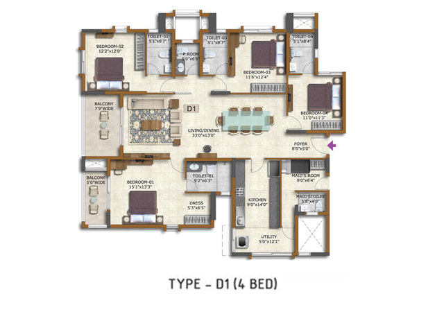 FOYER/ LIVING/ DINING/ BEDROOMS: VITRIFIED TILE FLOORING BATHROOMS/ BALCONY/ KITCHEN: CERAMIC TILE FLOORING