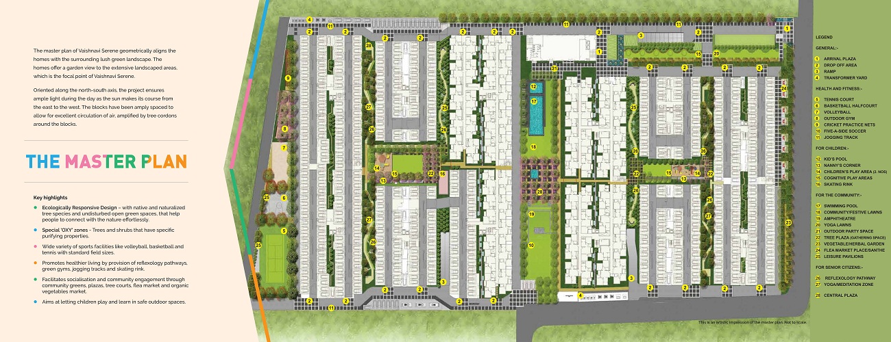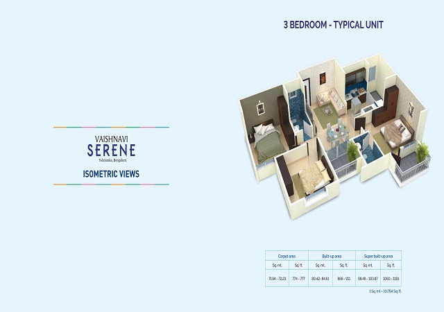 Vaishnavi Serene in Yelahanka, Bangalore North by Vaishnavi Group Bangalore is a residential project. The project offers Apartment with perfect combination of contemporary architecture and features to provide comfortable living. The Apartment are of the following configurations: 1BHK, 2BHK and 3BHK The size of the Apartment ranges in between 635.0 sq.ft. and 1118.0 sq.ft. Vaishnavi Serene price ranges from 29.21 Lacs to 53.66 Lacs. Vaishnavi Serene offers facilities such as Gymnasium and Lift. It also has amenities like Badminton court, Basketball court, Jogging track, Lawn tennis court and Swimming pool. The project has indoor activities such as Pool table. It also offers services like Banquet hall and Grocery shop. It also offers Car parking. This is a RERA registered project with registration number PRM/KA/RERA/1251/309/PR/180905/001990. It is an under construction project with possession offered in Dec, 2022. The project is spread over a total area of 10.82 acres of land. It has 60% of open space. Vaishnavi Serene has a total of 12 towers. The construction is of 4 floors. An accommodation of 896 units has been provided.