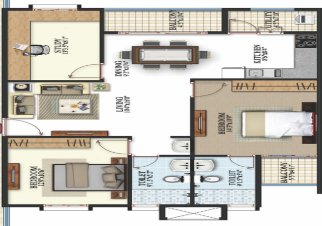 WOODEN FLOORING IN MASTER BEDROOM AND VITRIFIED TILES IN LIVING, DINING,KITCHEN AND OTHER BEDROOMS. ANTI – SKID CERAMIC TILES IN BATHROOMS AND BALCONIES.
