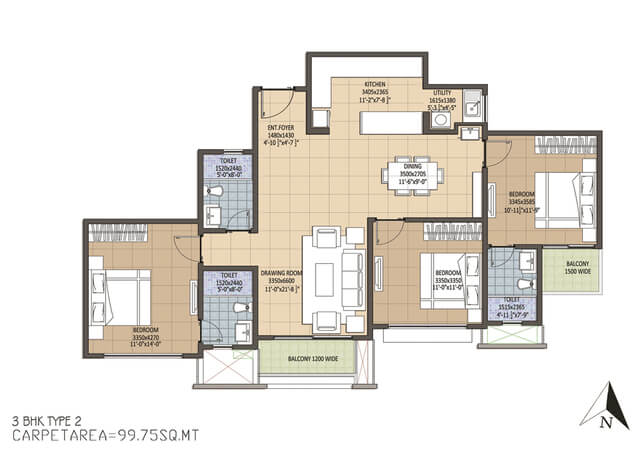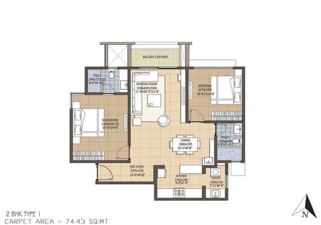 DOUBLE CHARGED VITRIFIED TILES FLOORING WITH NANO FINISH FOR FOYER, LIVING, DINING, KITCHEN AND BED ROOMS. ANTI SKID CERAMIC FLOORING IN TOILETS, BALCONY, UTILITY, SERVANTS ROOM AND TOILET.