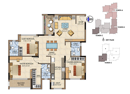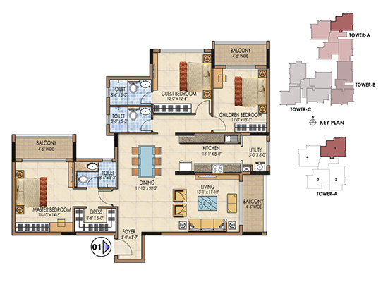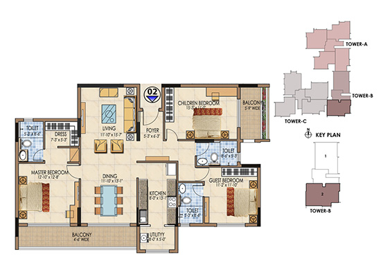 LIFT LOBBY: GRANITE FLOORING/VITRIFIED FLOORING CORRIDORS: VITRIFIED TILES FLOORING FOYER, LIVING AND DINING: VITRIFIED TILES FLOORING BEDROOMS AND KITCHEN: VITRIFIED TILES FLOORING BALCONY AND UTILITY: ANTI-SKID CERAMIC TILES TOILETS: ANTI-SKID CERA